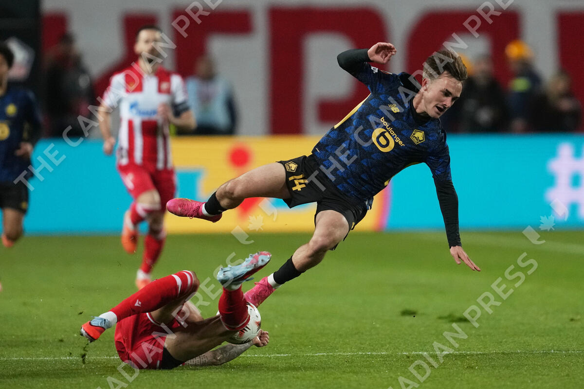 Lille's Marius Broholm, top, is fouled by Red Star's Timi Max Elsnik during the Europa League opening phase soccer match between Red Star and Lille, in Belgrade, Serbia, Thursday, Nov. 6, 2025. (AP Photo/Darko Vojinovic)