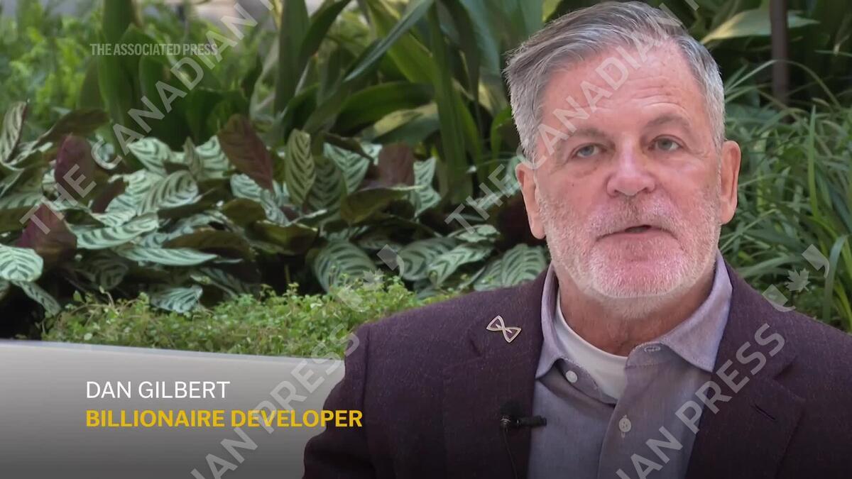 Crews unfurl an oversized American flag on the facade of the new Hudson’s building in downtown Detroit (AP video: Mike Householder)
