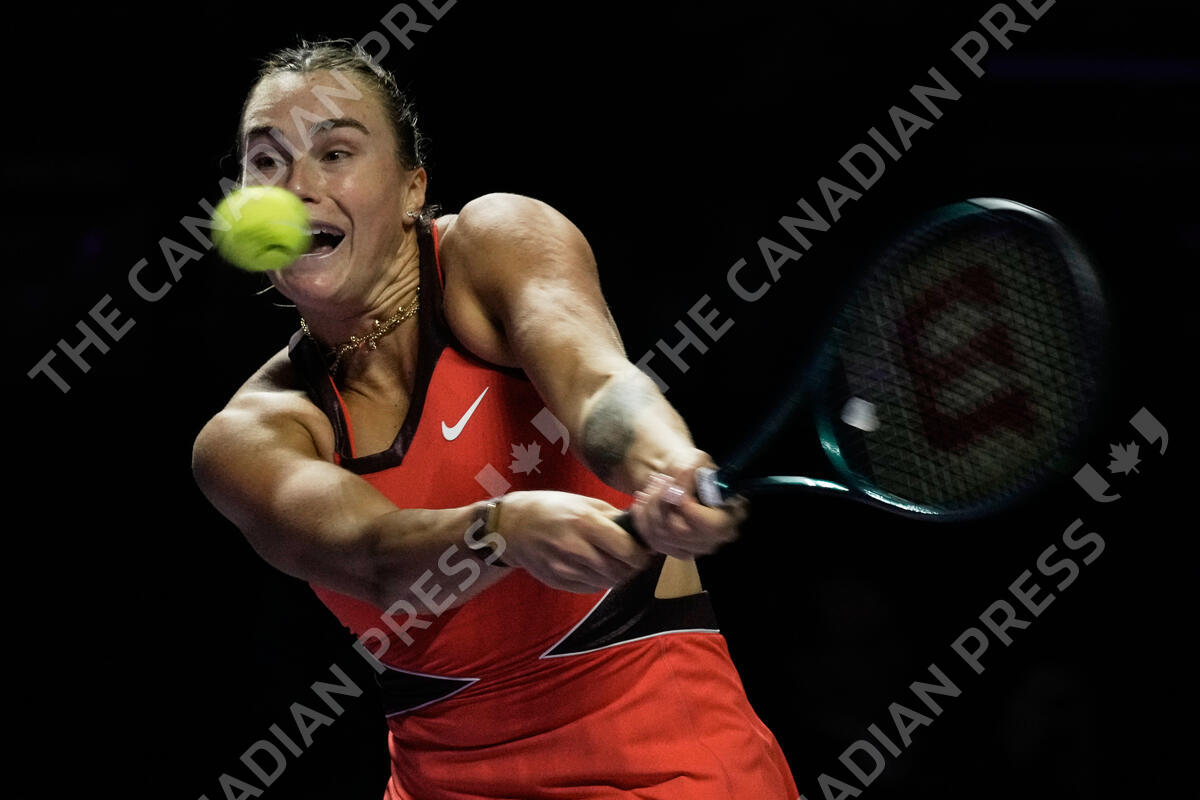 Aryna Sabalenka of Belarus plays a backhand return to Coco Gauff of the United States during their women's singles match at the WTA tennis finals in Riyadh, Saudi Arabia, Thursday, Nov. 6, 2025. (AP Photo/Fatima Shbair)