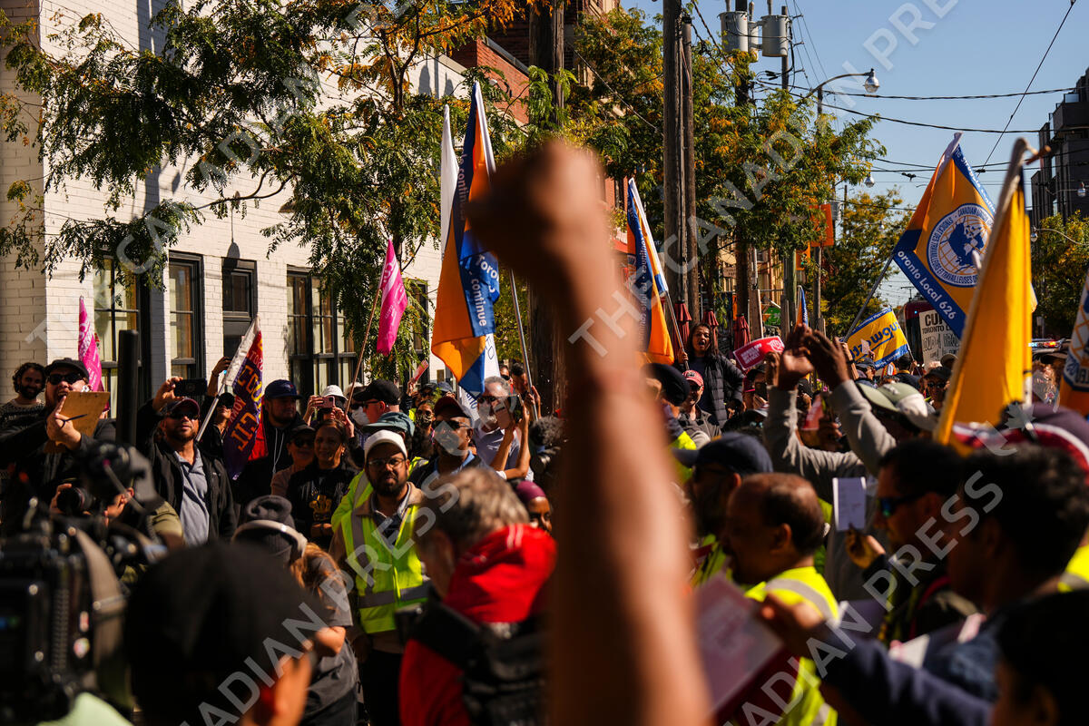Canada Post workers are joined by CUPE union members as they hold a rally outside MP Julie Dabrusin's office in Toronto on Wednesday, Oct. 1, 2025. THE CANADIAN PRESS/Chris Young