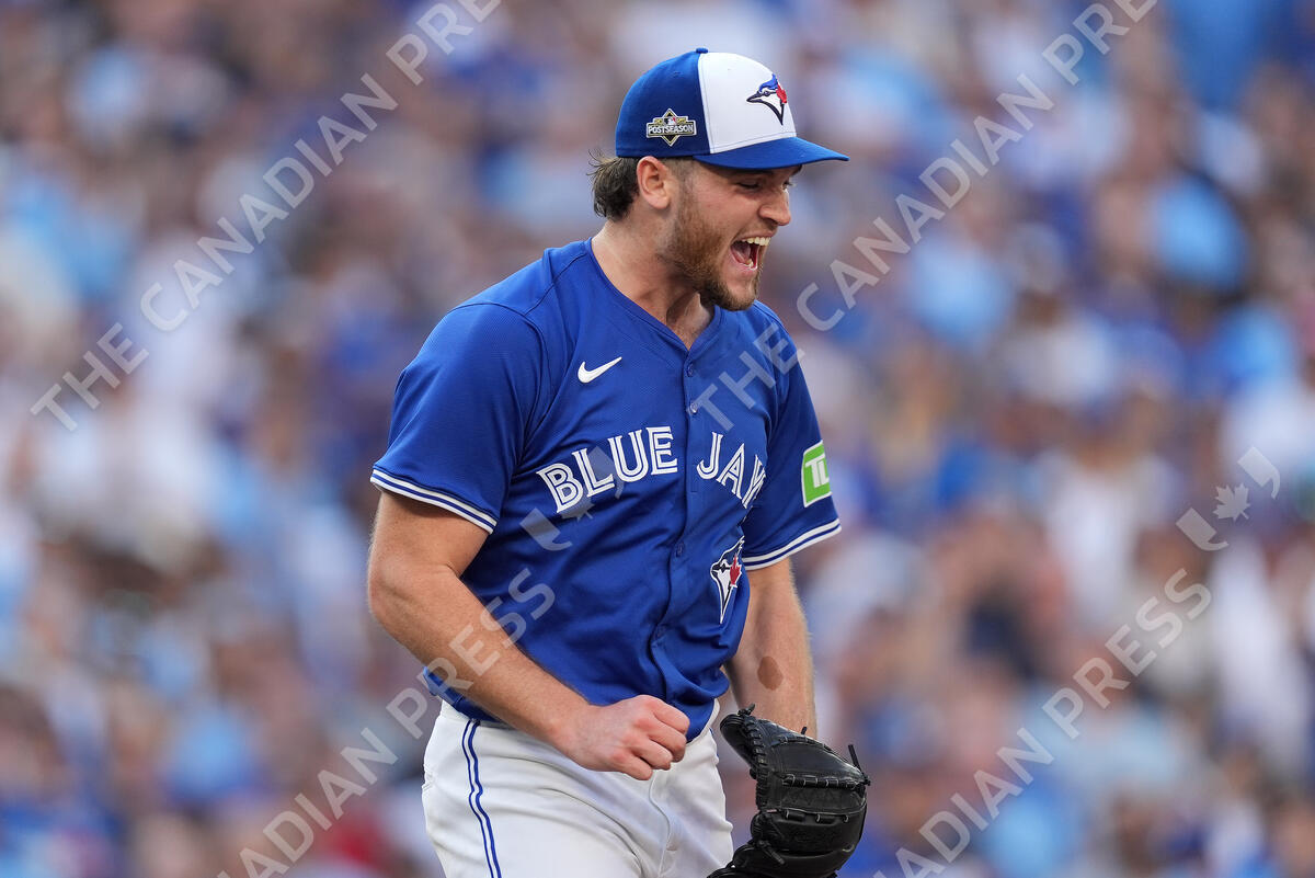 Toronto Blue Jays pitcher Trey Yesavage (39) celebrates after striking out the New York Yankees side during fourth inning MLB American League Division Series baseball action in Toronto, Sunday, Oct. 5, 2025. THE CANADIAN PRESS/Frank Gunn