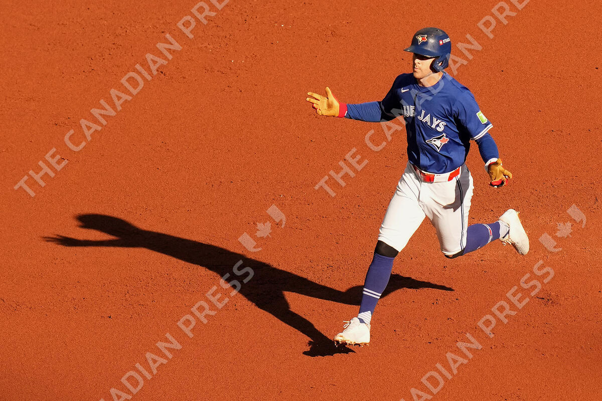 Toronto Blue Jays third baseman Ernie Clement (22) celebrates as he rounds the bases following his two run home run during second inning MLB American League Division Series baseball action against the New York Yankees, in Toronto, Sunday, Oct. 5, 2025. THE CANADIAN PRESS/Chris Young