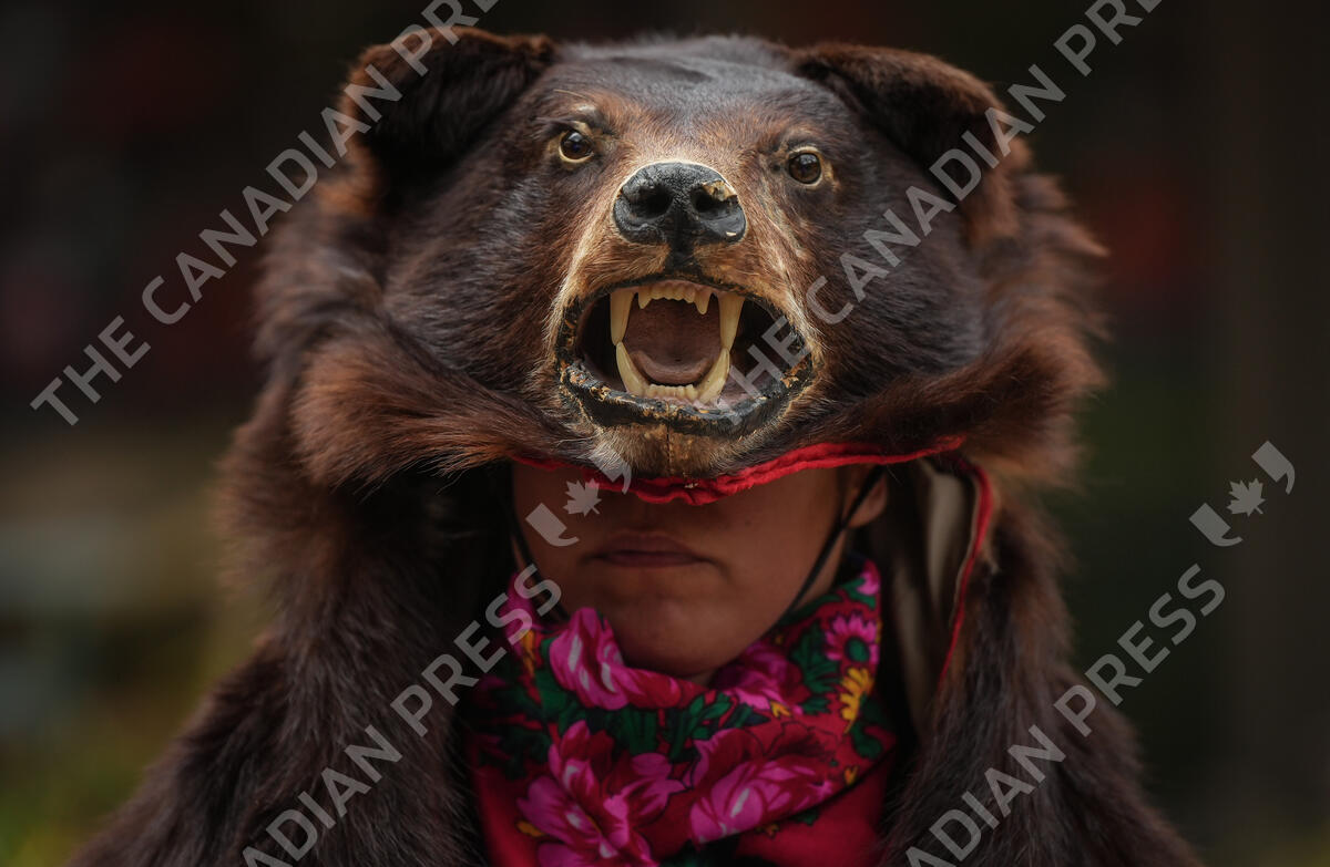 Aileen Michel (L'il Bear) prepares to perform a bear dance during a gathering to mark the National Day for Truth and Reconciliation, in Vancouver, on Tuesday, September 30, 2025. THE CANADIAN PRESS/Darryl Dyck