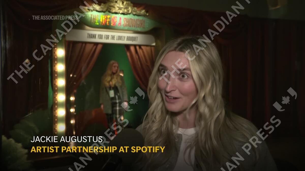 Taylor Swift fans gathered in New York on Thursday for a Spotify-sponsored pop-up activation featuring photo opportunities and lyrics from "The Life of a Showgirl," releasing Friday. (Oct. 2)