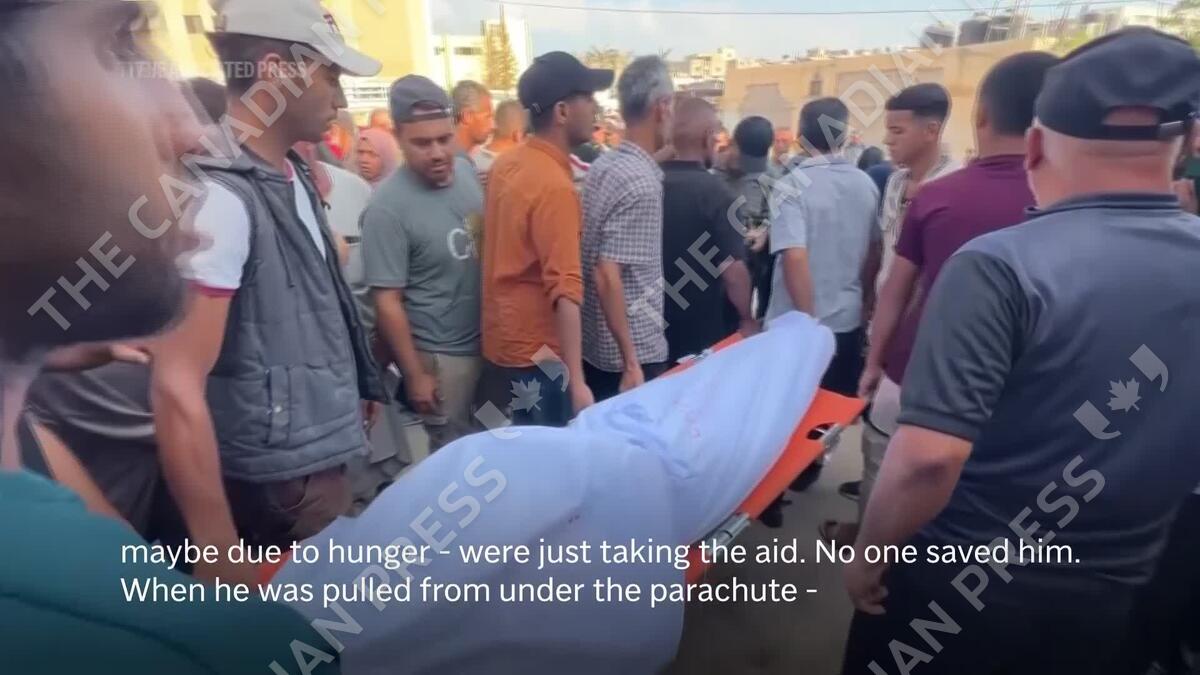Relatives of Mohammed al-Zameli gathered around his body to pay their last respects to the 75 year-old-man who was killed when aid being airdropped over the Gaza Strip hit his tent in Muwasi, his family said.