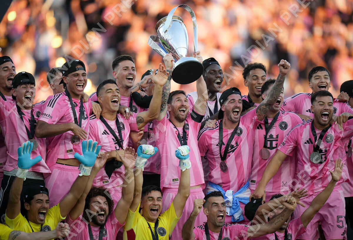 Inter Miami's Lionel Messi, centre, hoists the trophy as he celebrates with his teammates after defeating the Vancouver Whitecaps during the MLS Cup final soccer match, in Fort Lauderdale, Fla., on Saturday, December 6, 2025. THE CANADIAN PRESS/Darryl Dyck
