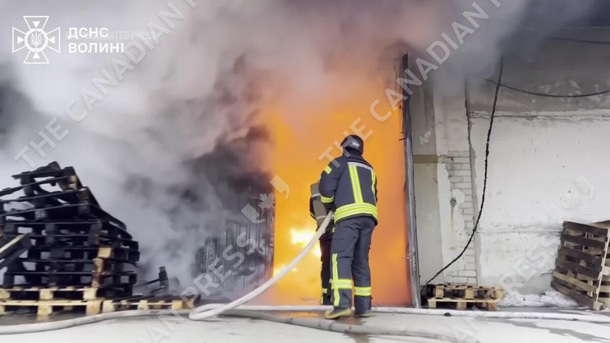 Firefighters tackle a blaze in Lutsk after Russia attacks Ukraine with drones and missiles