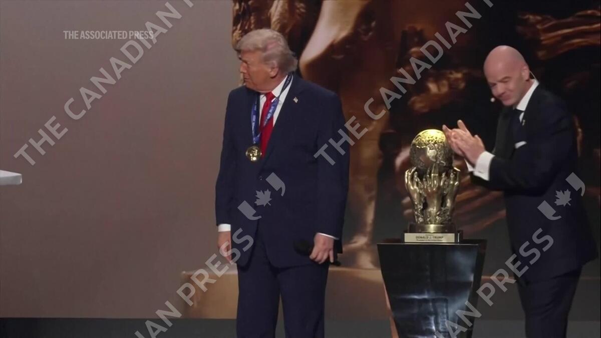 CP174897161 | Trump holds World Cup trophy and is given finals ticket as he announces 2026 draw to be held in DC