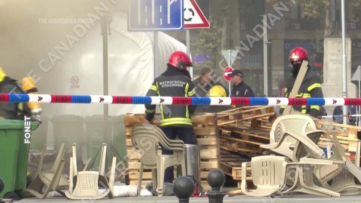 A fire and reported shooting at a camp hosting loyalists of Serbian President Aleksandar Vucic in central Belgrade on Wednesday injured one person, officials said, while Vucic described the incident as a “terrorist attack.”