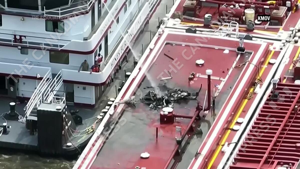 Two die when helicopter strikes power lines and crashes into a barge on the Mississippi River