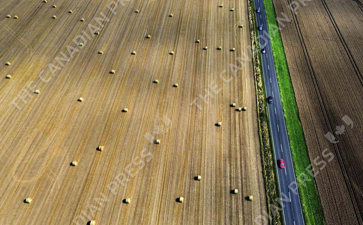 Straw bales lie on a field in the outskirts of Frankfurt, Germany, Wednesday, July 30, 2025. (AP Photo/Michael Probst)