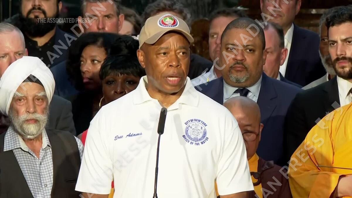 New York Mayor Eric Adams attended a multi-faith vigil on Tuesday evening for the four people who were shot dead inside a Manhattan office tower a day earlier. (AP video by Joseph Frederick)