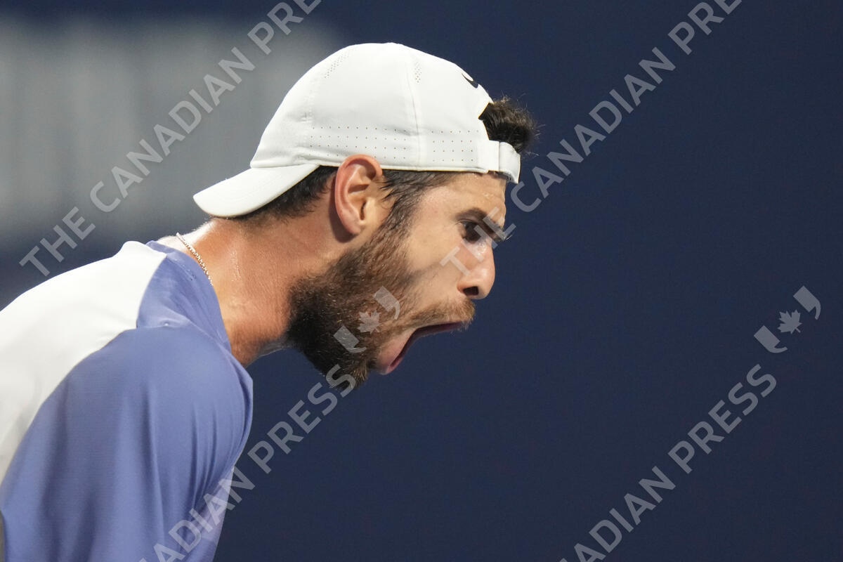 Karen Khachanov of Russia celebrates after winning the first set 7-6 against Ben Shelton of the USA during the men's tennis final at the National Bank Open in Toronto on Thursday, August 7, 2025. THE CANADIAN PRESS/Chris Young