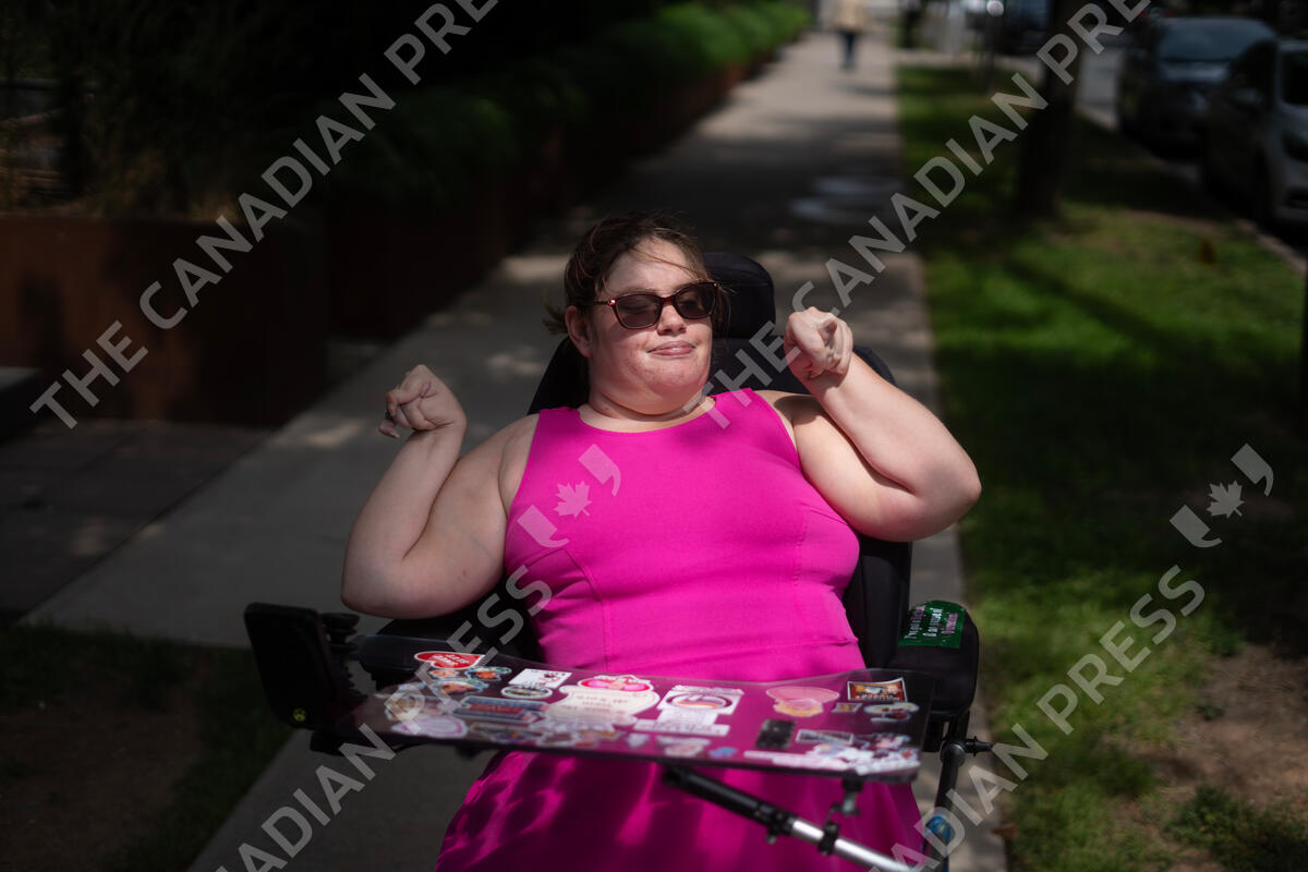 Vicky Levack, a spokeswoman for the Disability Rights Coalition who lives with cerebral palsy, poses outside her apartment building in Halifax on Thursday, July 31, 2025. THE CANADIAN PRESS/Darren Calabrese