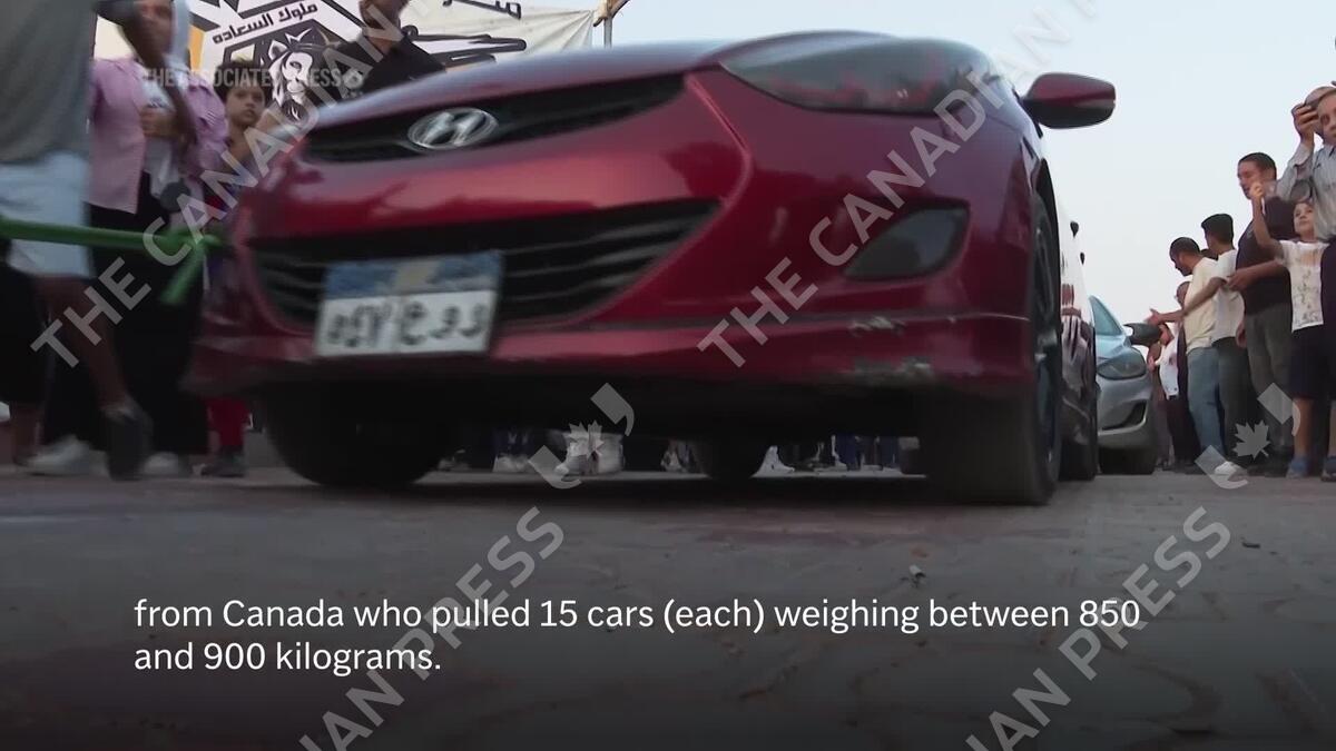Egypt's strongman Ashraf Mahrous, also known by his nickname Kabonga pulled 20 cars on Friday during an attempt to create a new Guinness world record of most cars pulled by an individual. (AP Video shot by Ahmed Hatem)