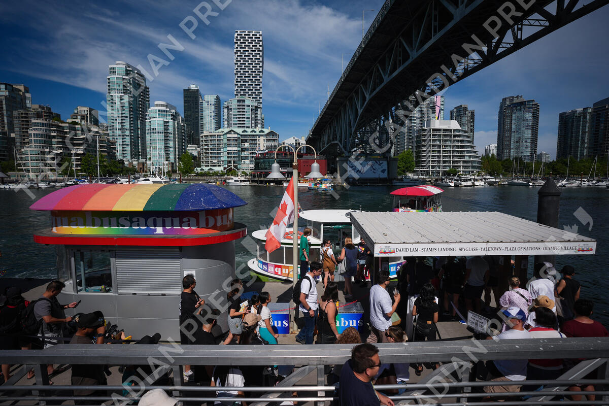 Tourists line up to take an Aquabus water taxi tour of False Creek, from Granville Island in Vancouver, B.C., Friday, Aug. 1, 2025. THE CANADIAN PRESS/Darryl Dyck
