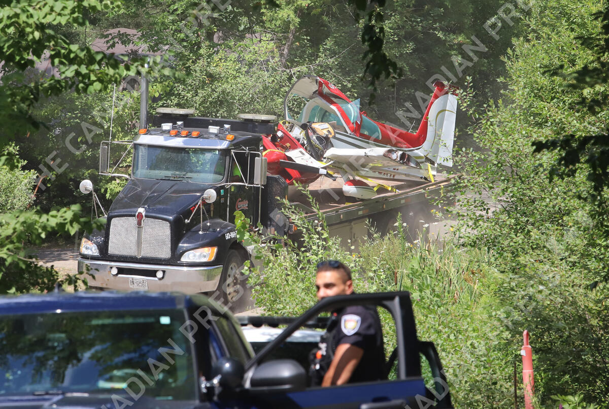 The wreckage of a small plane that crashed on Thursday, July 31, 2025, near the Ottawa International Airport, is removed from the crash site on Friday, Aug. 1, 2025. THE CANADIAN PRESS/Patrick Doyle
