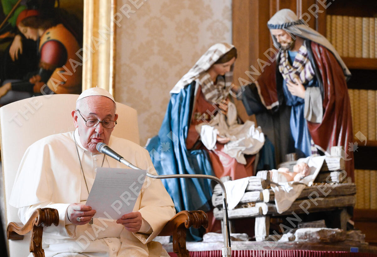 Pope Francis during the weekly general audience with the crib in Apostolic Palace, at the Vatican on December 16, 2020. Photo by Vatican Media/CPP/IPA/ABACAPRESS.COM