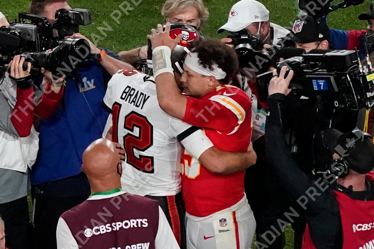 Tampa Bay Buccaneers' Tom Brady (12) and Kansas City Chiefs' Patrick Mahomes (15) greet following the NFL Super Bowl 55 football game Sunday, Feb. 7, 2021, in Tampa, Fla. The Buccaneers defeated the Chiefs 31-9 to win the Super Bowl. (AP Photo/Chris Carlson)