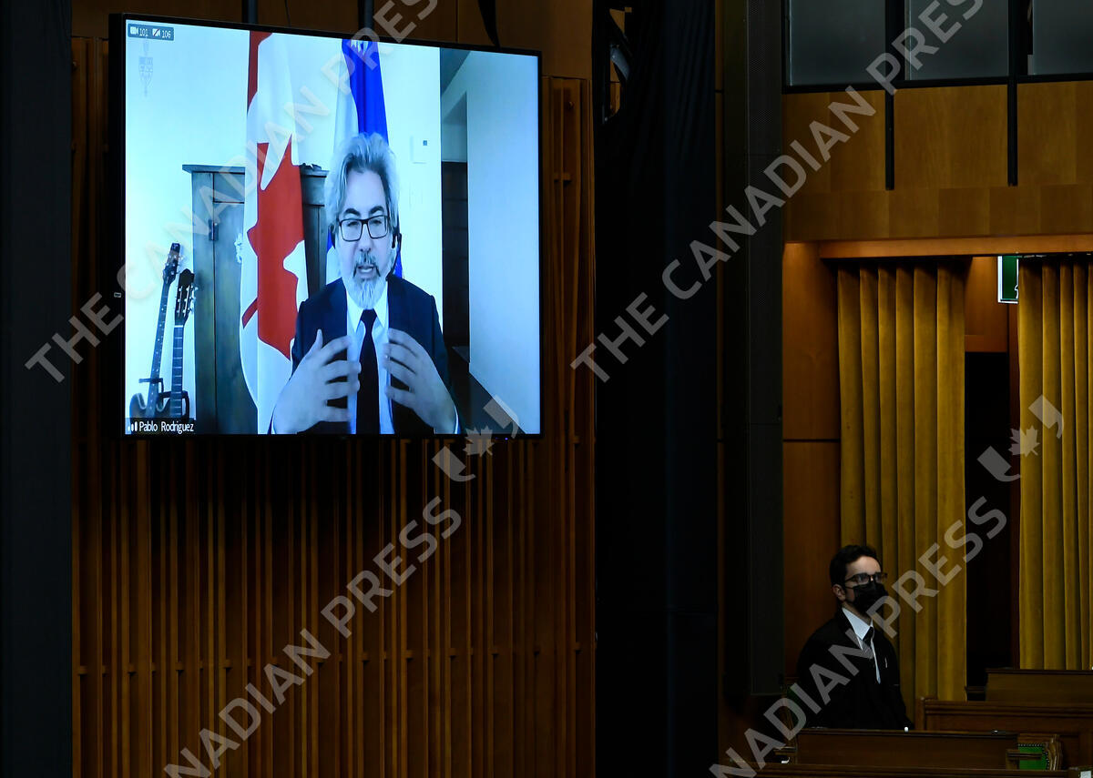 Leader of the Government in the House of Commons Pablo Rodriguez is seen via videoconference as he rises during Question Period in the House of Commons on Parliament Hill in Ottawa on Friday, Jan. 29, 2021. THE CANADIAN PRESS/Justin Tang