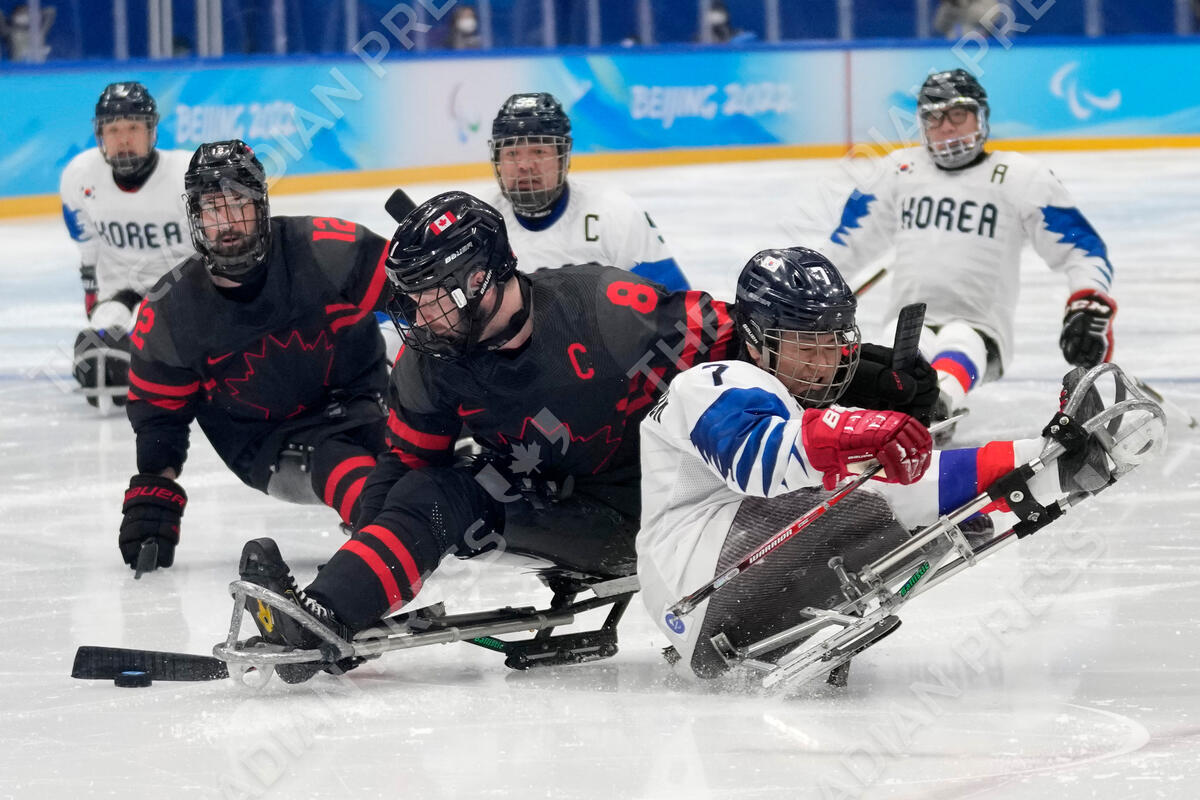 South Korea's Choi Kwang-hyuk, right, battles for the puck against Tyler McGregor of Canada during they para ice hockey preliminary match at the 2022 Winter Paralympics, Tuesday, March 8, 2022, in Beijing. (AP Photo/Dita Alangkara)