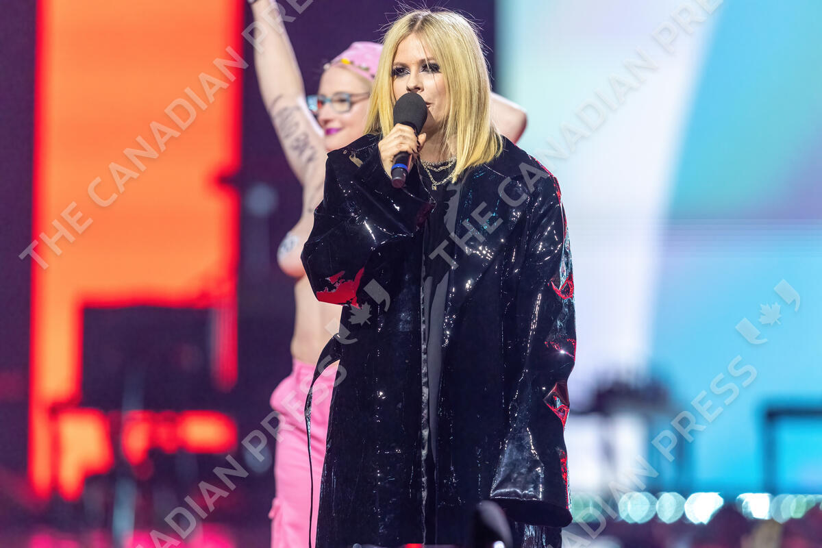 Avril Lavigne presents as a topless protester rushes the stage during the Junos Monday, March 13, 2023. Police say charges are pending after a topless protester interrupted the Juno Awards. THE CANADIAN PRESS/Timothy Matwey