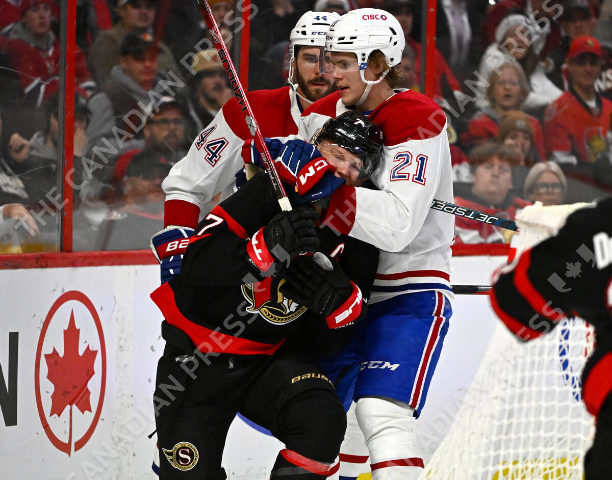 Montreal Canadiens defenceman Kaiden Guhle (21) grabs onto Ottawa Senators left wing Brady Tkachuk (7) during second period NHL hockey action in Ottawa, on Wednesday, Dec. 14, 2022. THE CANADIAN PRESS/Justin Tang