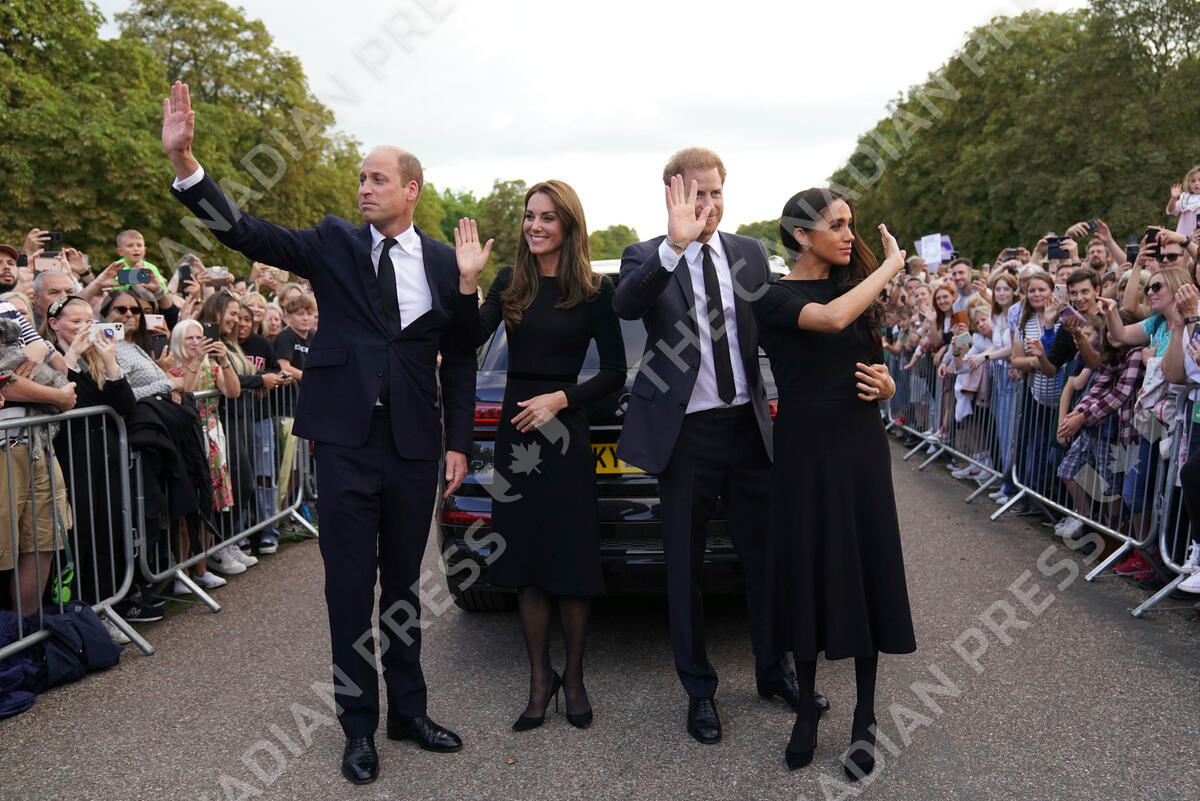 From left, Britain's Prince William, Prince of Wales, Kate, Princess of Wales, Prince Harry and Meghan, Duchess of Sussex wave to members of the public at Windsor Castle, following the death of Queen Elizabeth II on Thursday, in Windsor, England, Saturday, Sept. 10, 2022. (Kirsty O'Connor/Pool Photo via AP)