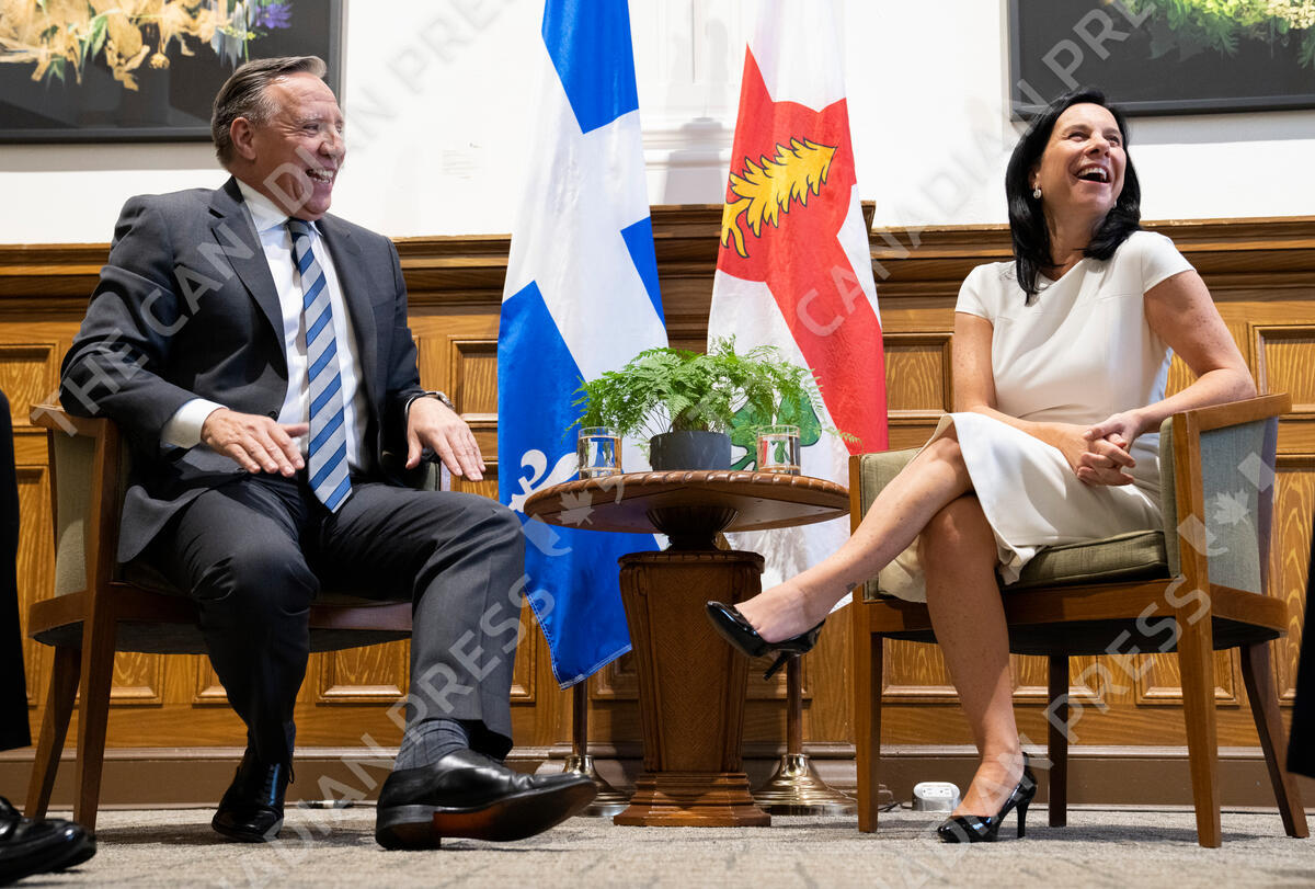 Coalition Avenir Quebec Leader Francois Legault and Montreal mayor Valerie Plante share a laugh prior to a meeting in Montreal, Que., Tuesday, Sept. 13, 2022. THE CANADIAN PRESS/Paul Chiasson