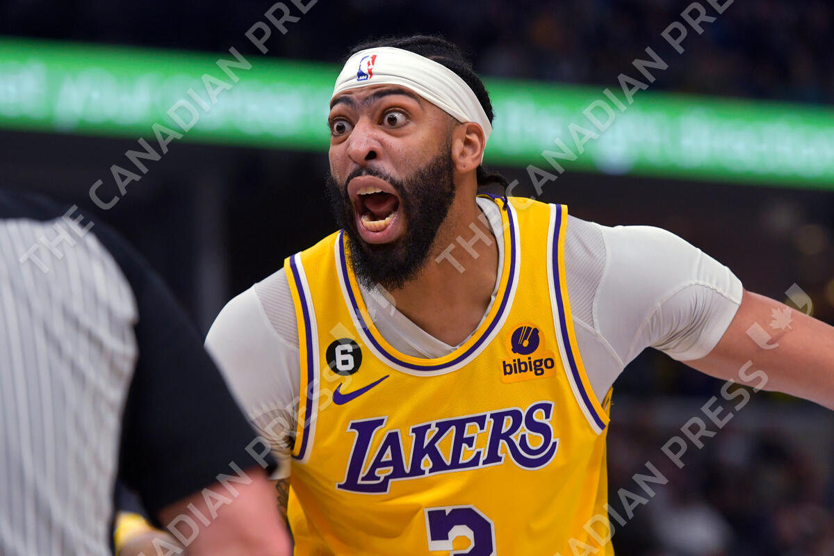 Los Angeles Lakers forward Anthony Davis (3) reacts to a referee's call during the first half of Game 5 of the team's first-round NBA basketball playoff series against the Memphis Grizzlies on Wednesday, April 26, 2023, in Memphis, Tenn. (AP Photo/Brandon Dill)