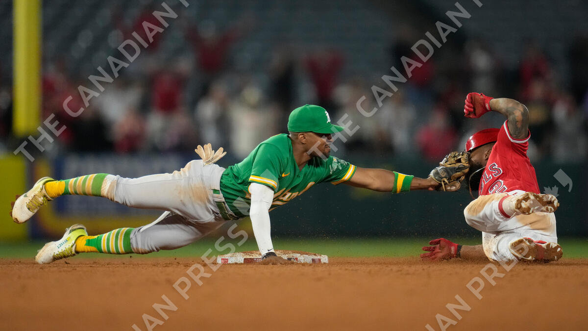 Los Angeles Angels' Luis Rengifo (2) is tagged out at second by Oakland Athletics left fielder Tony Kemp (5) during the tenth inning of a baseball game in Anaheim, Calif., Monday, April 24, 2023. (AP Photo/Ashley Landis)