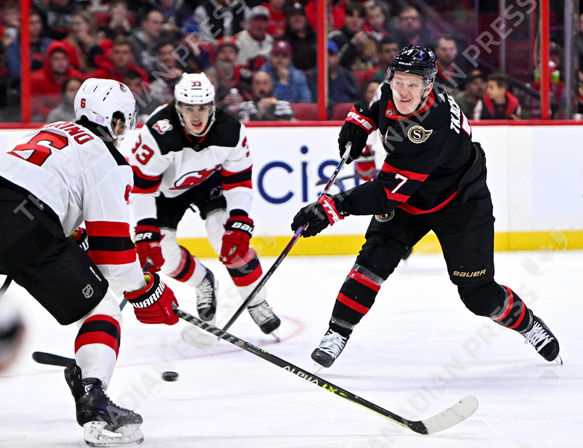 Ottawa Senators left wing Brady Tkachuk (7) takes a shot in front of New Jersey Devils defenceman John Marino (6) and defenceman Ryan Graves (33) during second period NHL hockey action in Ottawa, on Saturday, Nov. 19, 2022. THE CANADIAN PRESS/Justin Tang