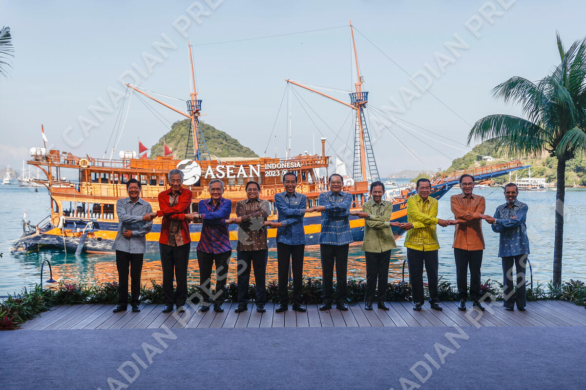 From left to right, Philippines' President Ferdinand Marcos Jr., Singapore's Prime Minister Lee Hsien Loong, Thailand's Deputy Prime Minister and Foreign Minister Don Pramudwinai, Vietnam's Prime Minister Pham Minh Chinh, Indonesia's President Joko Widodo, Laotian Prime Minister Sonexay Siphandone, Brunei's Sultan Hassanal Bolkiah, Cambodia's Prime Minister Hun Sen, Malaysia's Prime Minister Anwar Ibrahim and East Timor's Prime Minister Taur Matan Ruak hold hands for a family photo ahead of the retreat session at the 42nd ASEAN Summit in Labuan Bajo, East Nusa Tenggara province, Indonesia, Thursday, May 11, 2023. (Mast Irham/Pool Photo via AP)