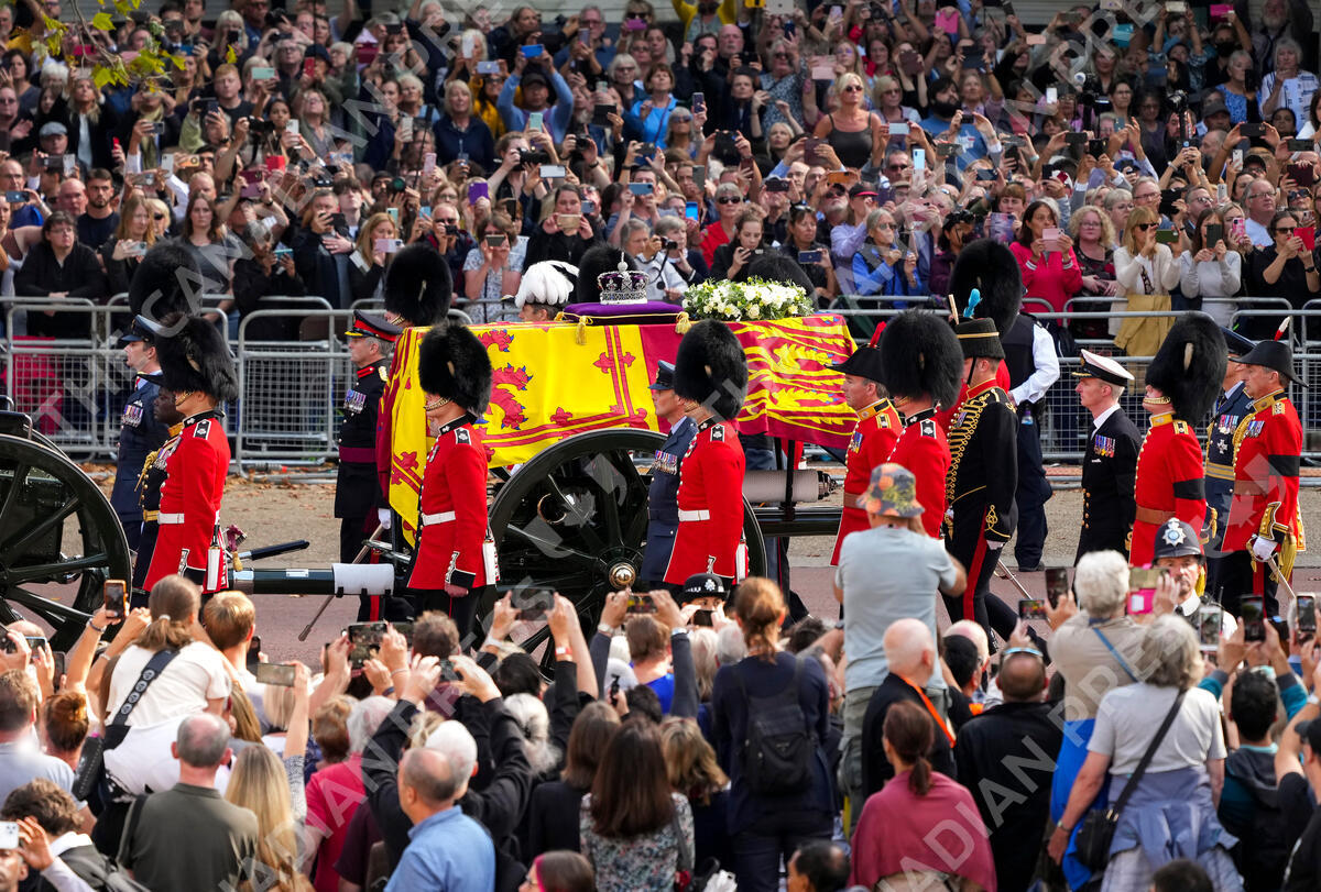 Thousands of people line the streets as the coffin of Queen Elizabeth leaves Buckingham Palace, followed by King Charles lll and royal family members as they make their way to Westminster Hall where the Queen will lie in state, in London on Wednesday, September 14, 2022. THE CANADIAN PRESS/Nathan Denette