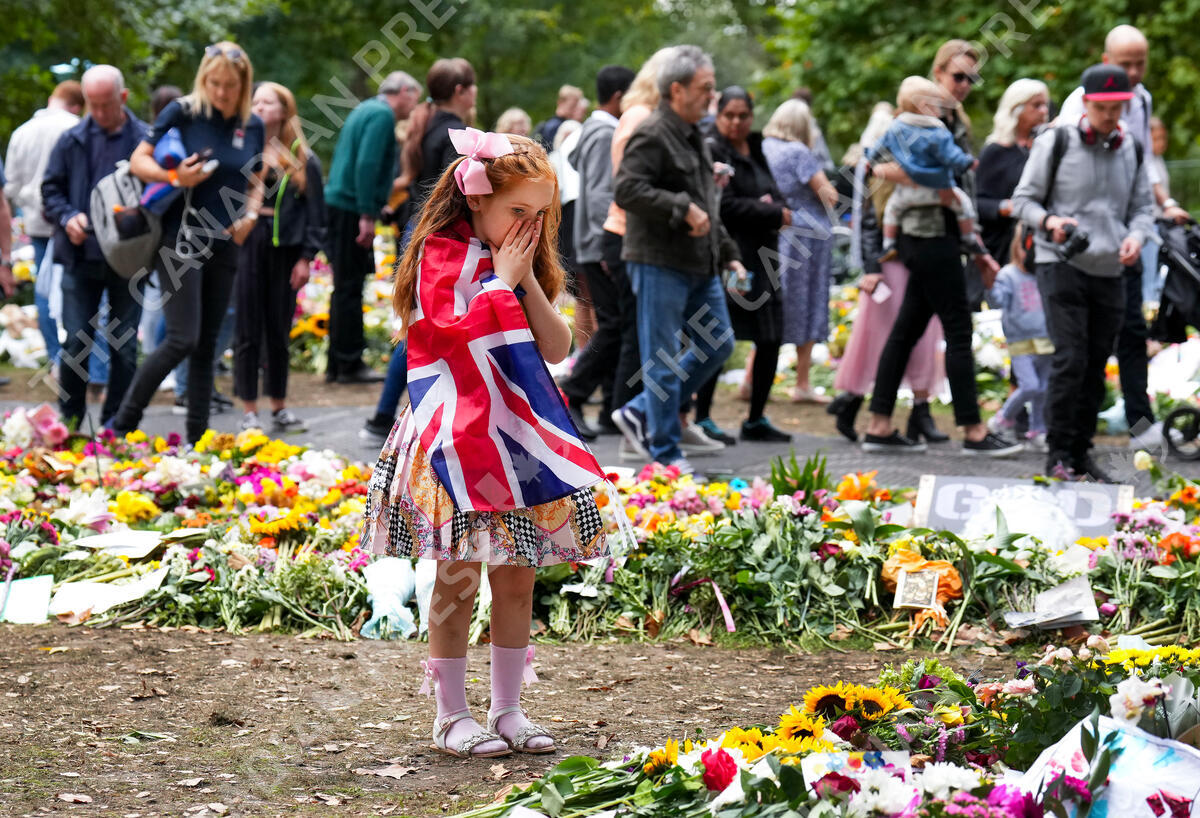 Ann Doran, 6, holds her face as she looks at part of the millions of flowers laid by mourners to pay their respect near the gates of Buckingham Palace in London on Thursday, Sept. 15, 2022. Queen Elizabeth II, Britain's longest-reigning monarch and a rock of stability across much of a turbulent century, died Thursday, Sept. 8, 2022, after 70 years on the throne. She was 96. THE CANADIAN PRESS/Nathan Denette