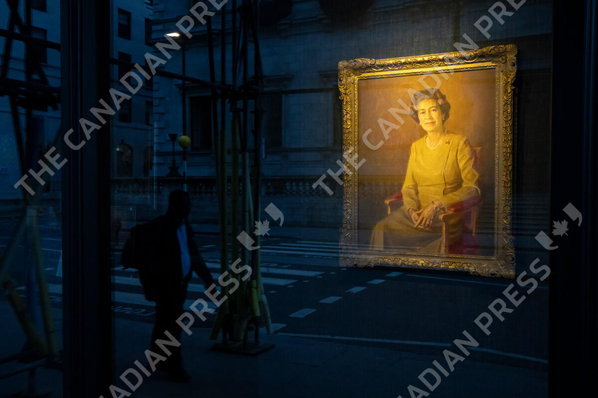 A man walks past a painting of Queen Elizabeth II displayed at a gallery in London, Saturday, Sept. 10, 2022. Queen Elizabeth II, Britain's longest-reigning monarch and a rock of stability across much of a turbulent century, died Thursday Sept. 8, 2022, after 70 years on the throne. She was 96. (AP Photo/Felipe Dana)