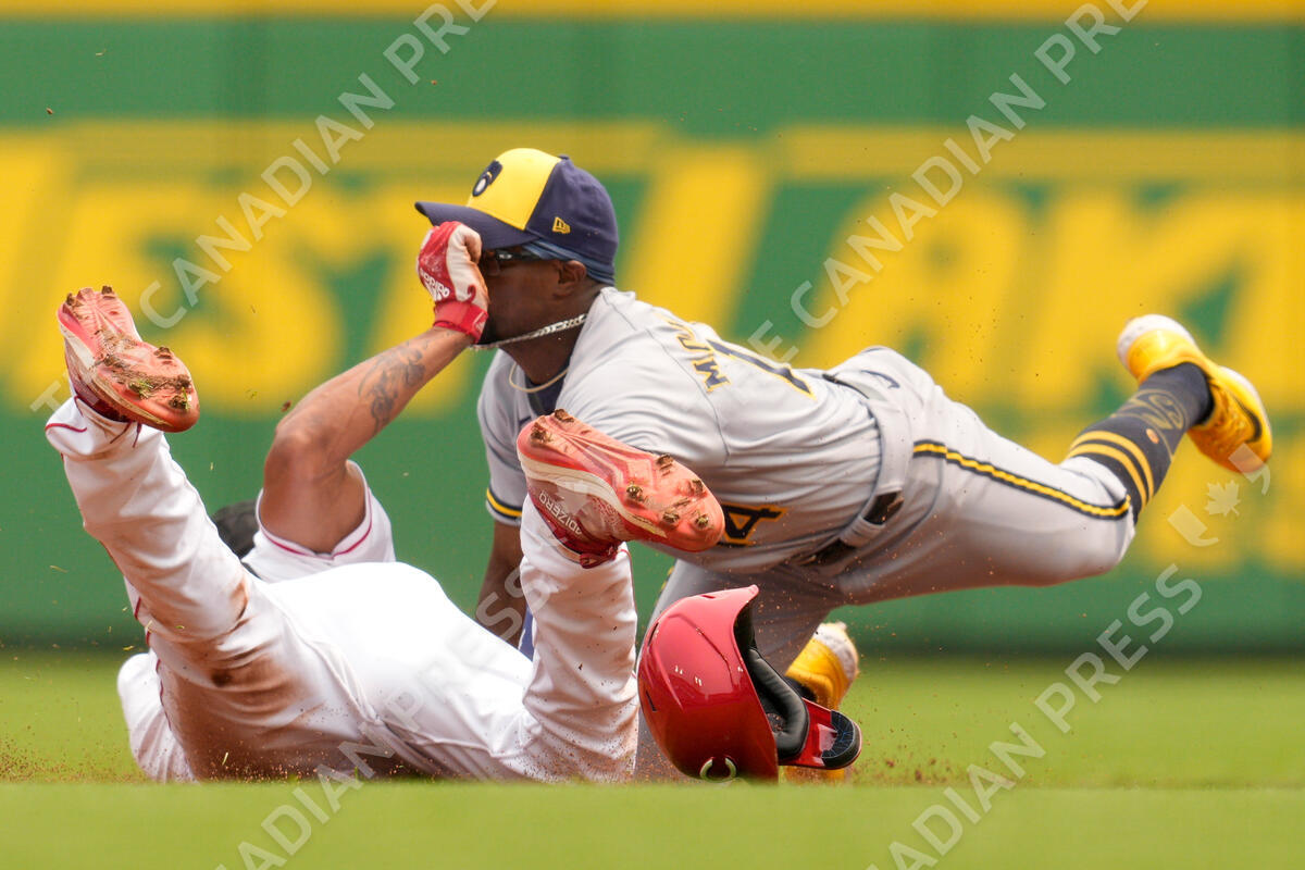 Milwaukee Brewers second baseman Andruw Monasterio, right, collides with Cincinnati Reds' Will Benson as he attempts to tag him out at second base in the third inning of a baseball game in Cincinnati, Sunday, June 4, 2023. (AP Photo/Jeff Dean)