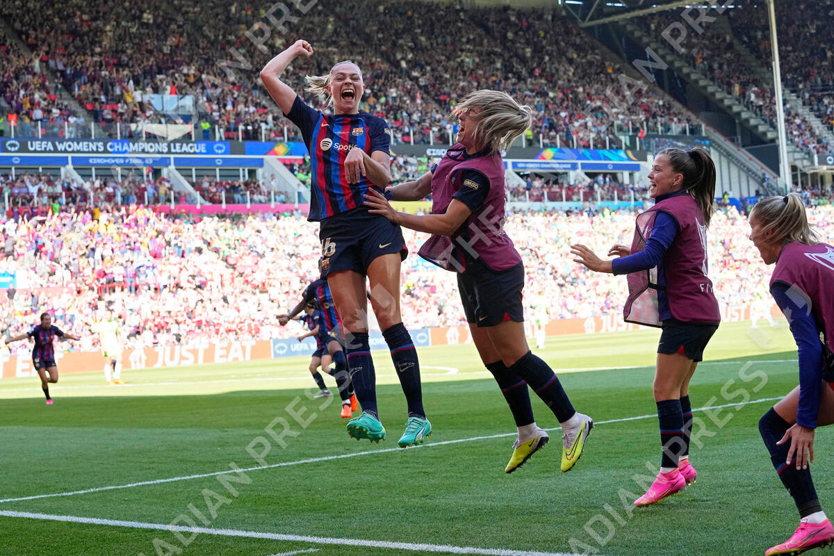 Barcelona's Fridolina Rolfo,left, celebrates after scoring her side's third goal during the Women's Champions League final soccer match between FC Barcelona and VfL Wolfsburg at the PSV Stadion in Eindhoven, Netherlands, Saturday, June 3, 2023. (AP Photo/Martin Meissner)