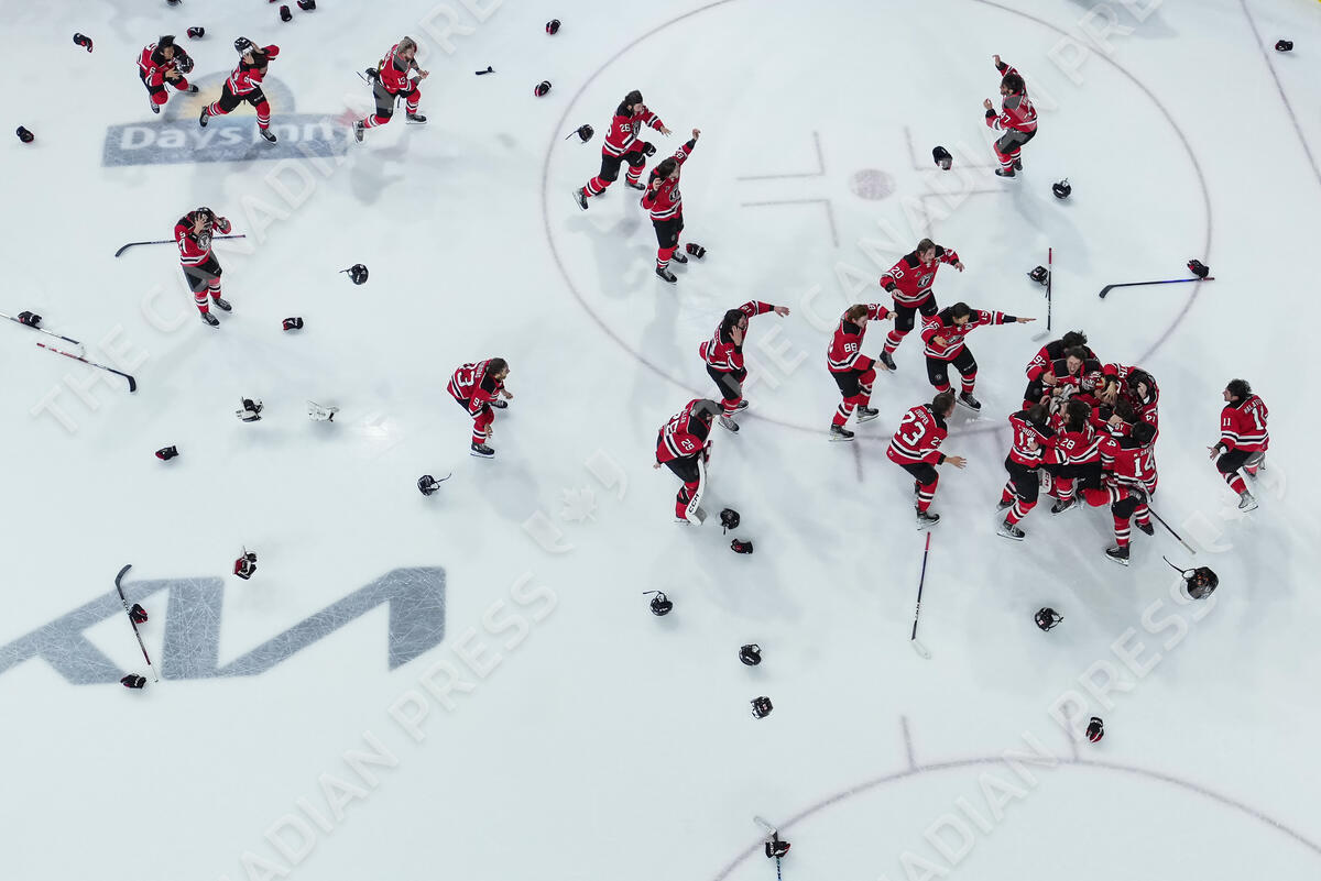 Equipment is scattered on the ice as Quebec Remparts players celebrate after Quebec defeated the Seattle Thunderbirds during Memorial Cup final hockey action, in Kamloops, B.C., on Sunday, June 4, 2023. THE CANADIAN PRESS/Darryl Dyck