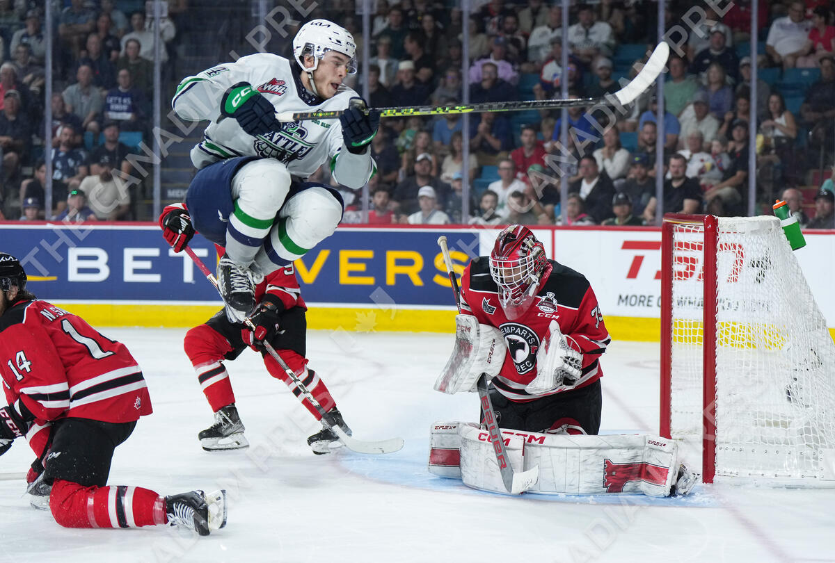 Seattle Thunderbirds' Colton Dach, left, jumps in front of Quebec Remparts goalie William Rousseau as the puck deflects off his mask during third period Memorial Cup final hockey action, in Kamloops, B.C., on Sunday, June 4, 2023. THE CANADIAN PRESS/Darryl Dyck