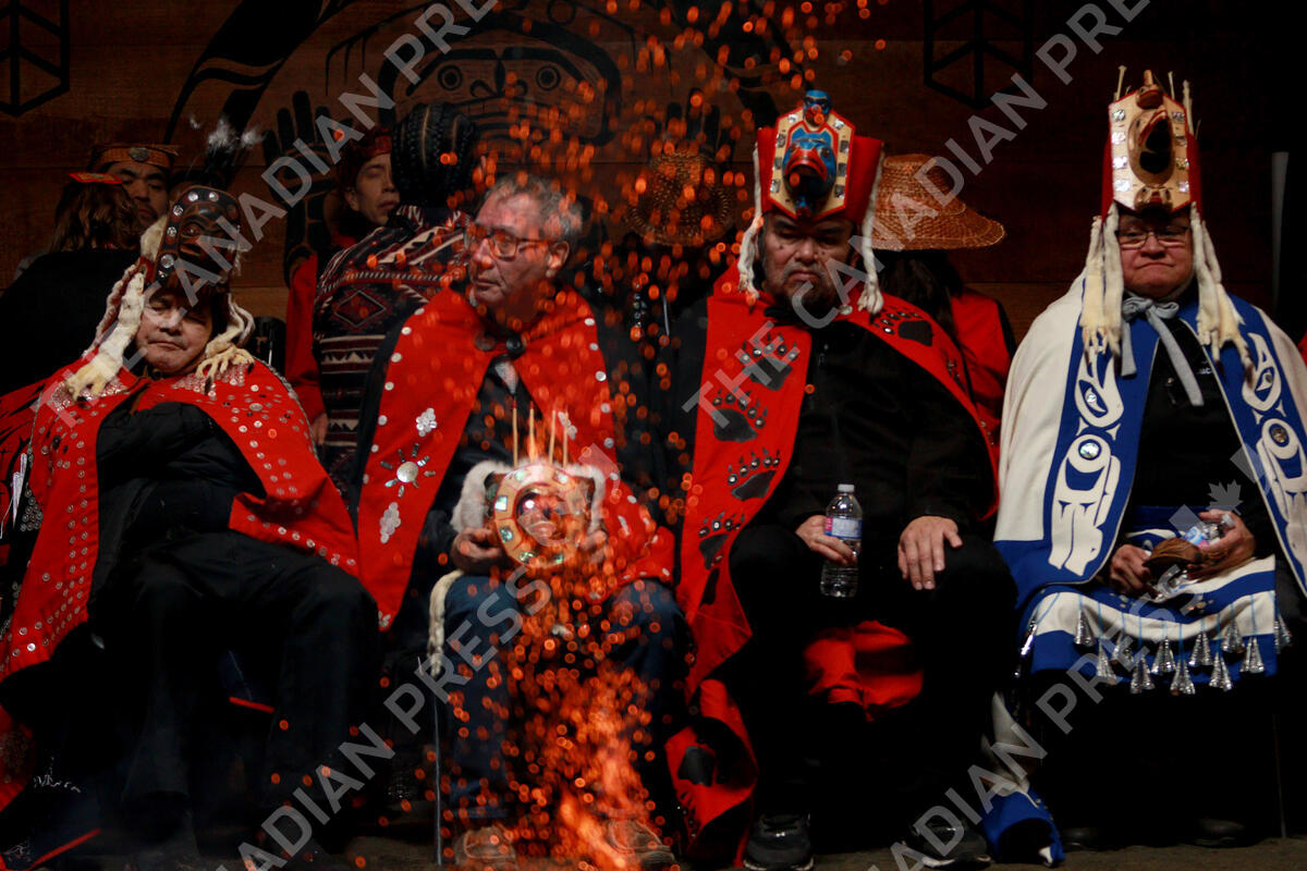Hereditary chiefs gathered to witness the historical repatriation of the Nuxalk Nation totem pole carved by the late Louie Snow after years of effort to release the pole back to the nation from the Royal BC Museum during a ceremony in Victoria, B.C., on Monday, February 13, 2023. THE CANADIAN PRESS/Chad Hipolito