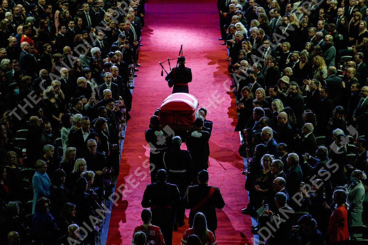 The casket of former Mississauga mayor Hazel McCallion arrives at the Paramount Fine Foods Centre for her state funeral in Mississauga, Ontario, Tuesday, Feb.14, 2023. THE CANADIAN PRESS/Cole Burston