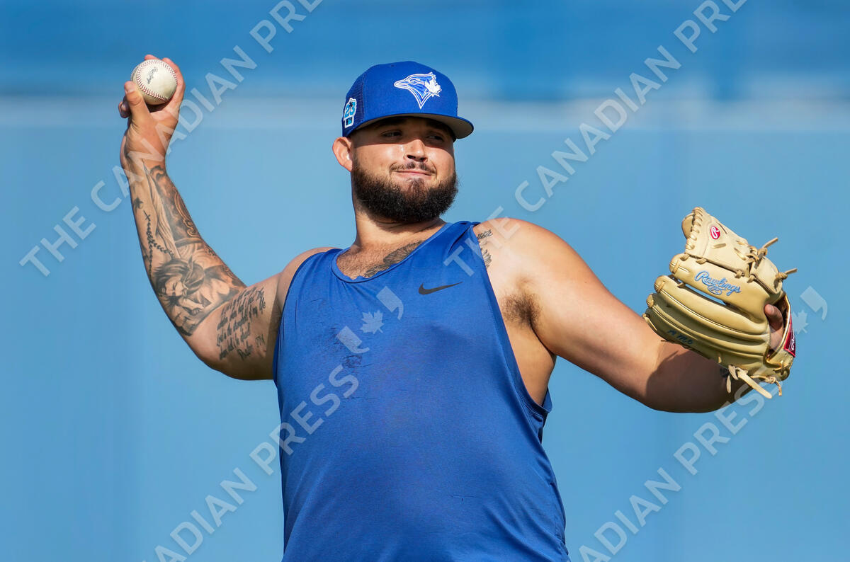 Toronto Blue Jays starting pitcher Alek Manoah warms his arm up during baseball spring training in Dunedin, Fla., on Sunday, February 19, 2023. THE CANADIAN PRESS/Nathan Denette
