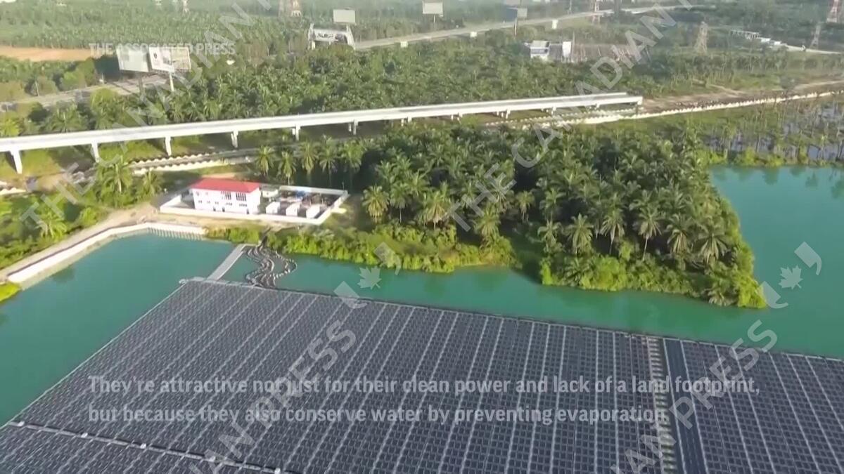 Floating solar panels are beginning to boom in the US after rapid growth in Asia. They're attractive not just for their clean power and lack of a land footprint, but because they also conserve water by preventing evaporation. (May 10) (AP Video: Haven Daley and Laura Bargfeld)