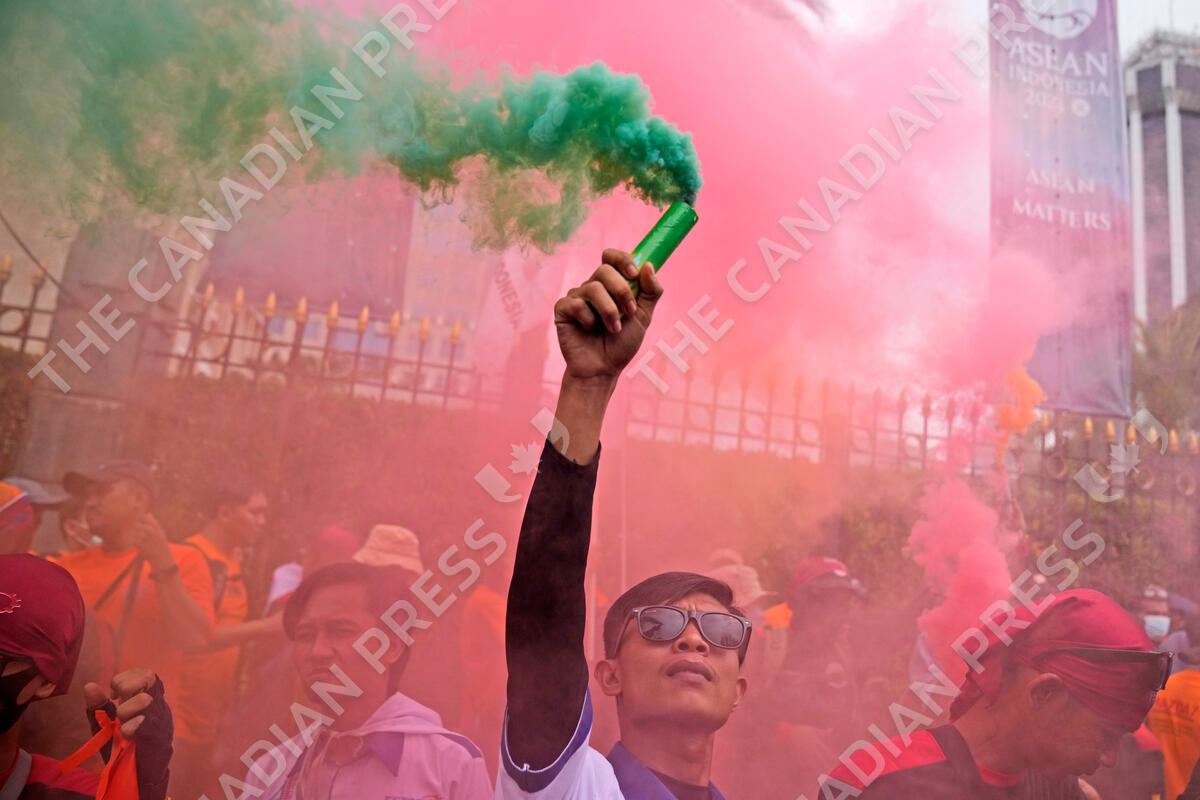 A worker holds up a smoke stick during a May Day rally in Jakarta, Indonesia, Monday, May 1, 2023. Workers and activists across Asia are marking May Day with protests calling for higher salaries and better working conditions, among other demands. (AP Photo/Dita Alangkara)