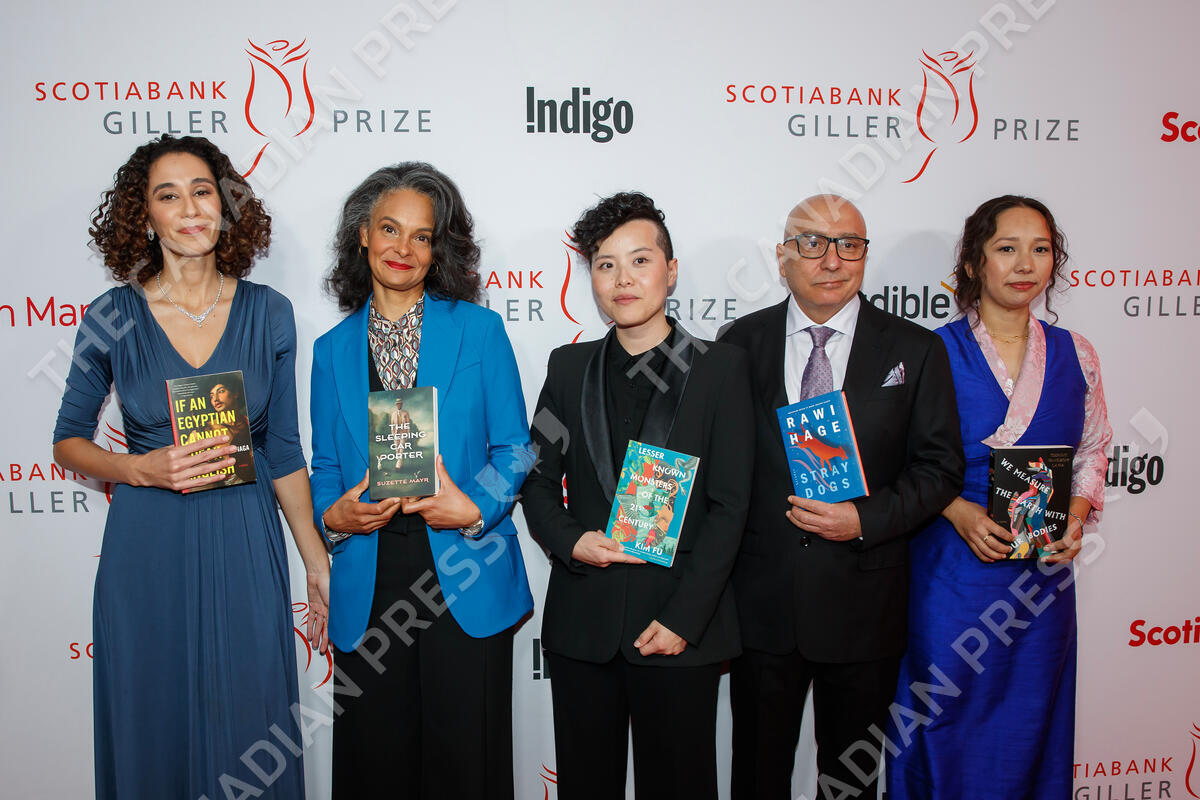 2022 Giller Prize finalists from left, Noor Naga, Suzette Mayr, Kim Fu, Rawi Hage, and Tsering Yangzom Lama, attend the 2022 Scotiabank Giller Prize in Toronto, Monday, Nov. 7, 2022. THE CANADIAN PRESS/Cole Burston