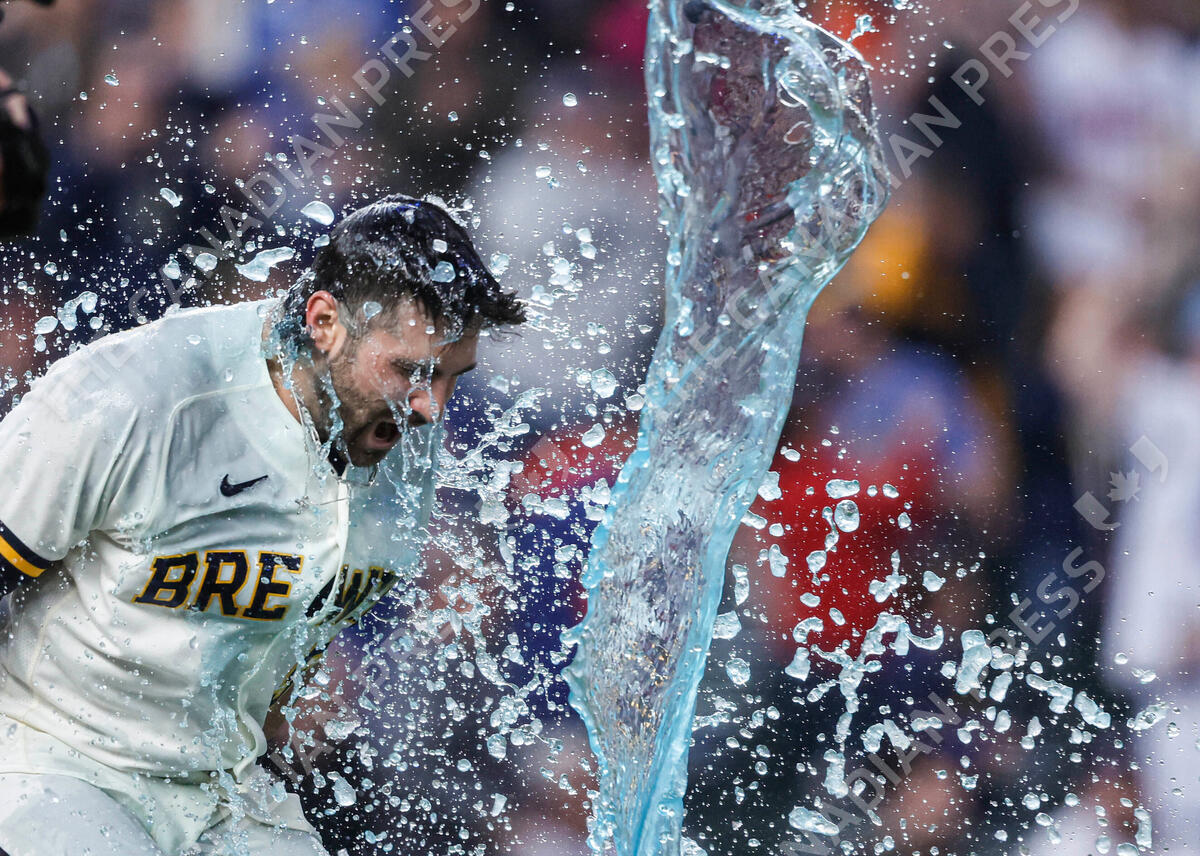 Milwaukee Brewers' Garrett Mitchell reacts after his game-winning home run during the ninth inning of a baseball game against the New York Mets in Milwaukee, Wednesday, April 5, 2023. The Brewers won 7-6. (AP Photo/Jeffrey Phelps)