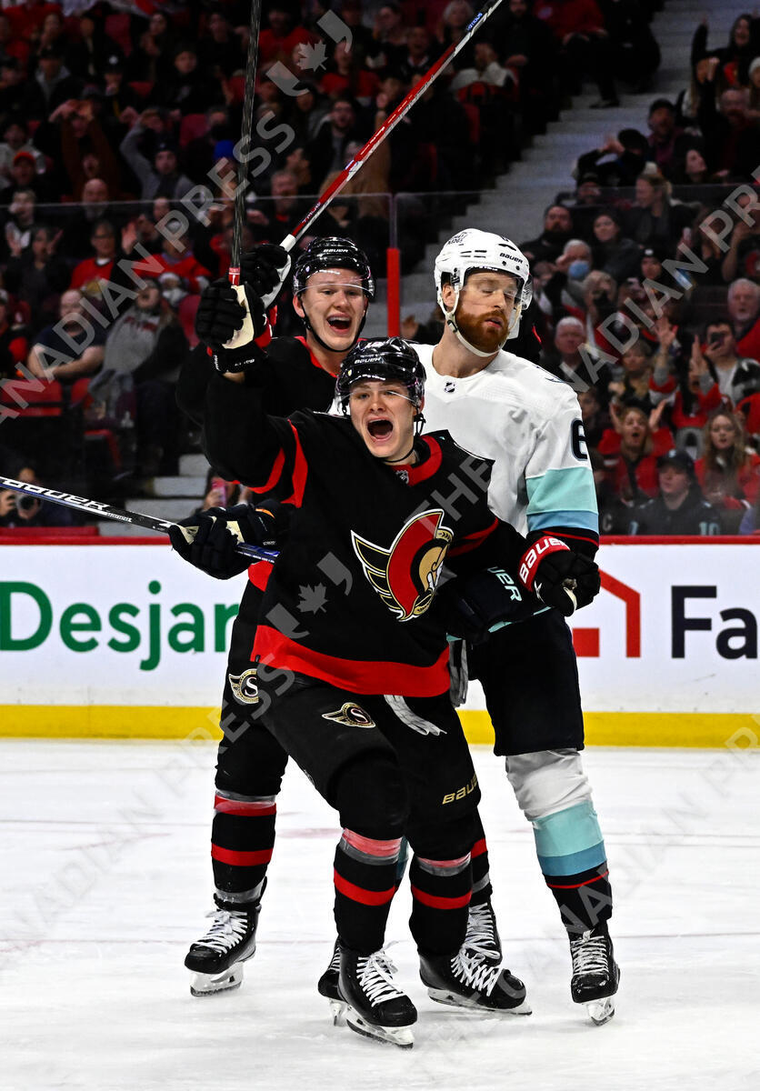 Ottawa Senators left wing Tim Stutzle (18) celebrates his goal with Ottawa Senators left wing Brady Tkachuk (7) as Seattle Kraken defenceman Adam Larsson (6) skates away, during second period NHL hockey action in Ottawa, on Saturday, Jan. 7, 2023. THE CANADIAN PRESS/Justin Tang