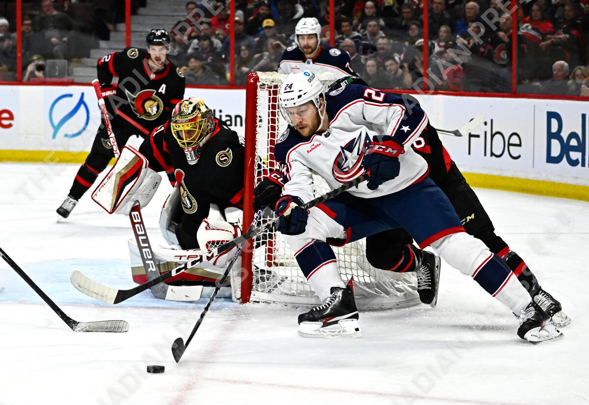 Columbus Blue Jackets right wing Mathieu Olivier (24) tries to wrap the puck around the net of Ottawa Senators goaltender Anton Forsberg (31) during first period NHL hockey action in Ottawa, on Tuesday, Jan. 3, 2023. THE CANADIAN PRESS/Justin Tang