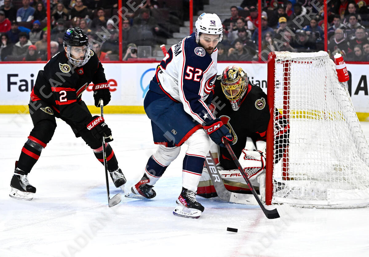 Columbus Blue Jackets right wing Emil Bemstrom (52) tries to get a chance on Ottawa Senators goaltender Anton Forsberg (31) during first period NHL hockey action in Ottawa, on Tuesday, Jan. 3, 2023. THE CANADIAN PRESS/Justin Tang